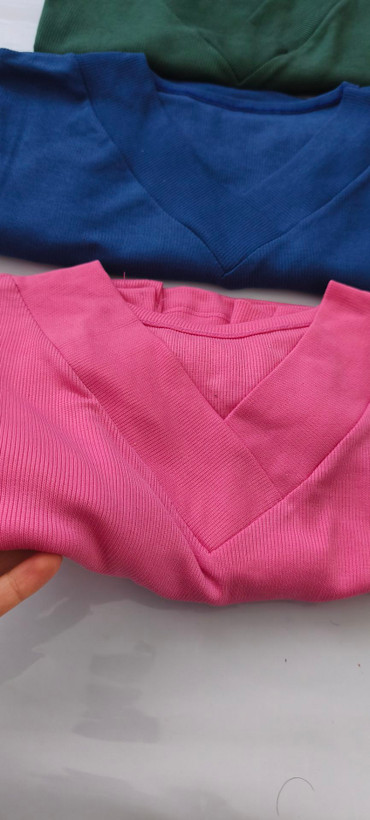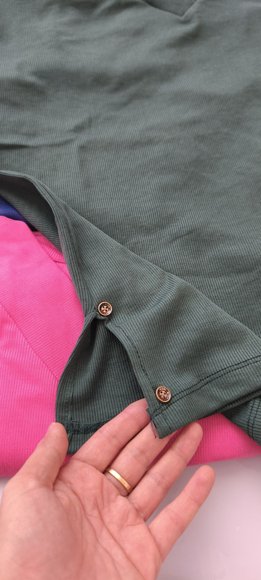 مدل کار یقه هفت استین کوتاه و پایین کار سه دکمه نصب شده و چاک کوتاهی داره
